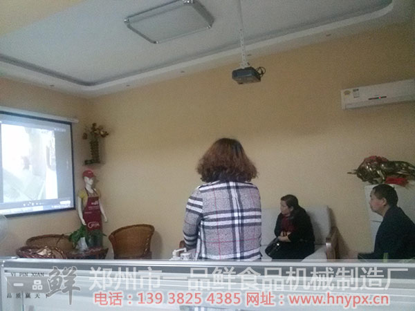 丁先生夫婦在觀看我們的餛飩片,餃子皮,拉面,拉條,燴面坯和一些加盟客戶的幻燈片